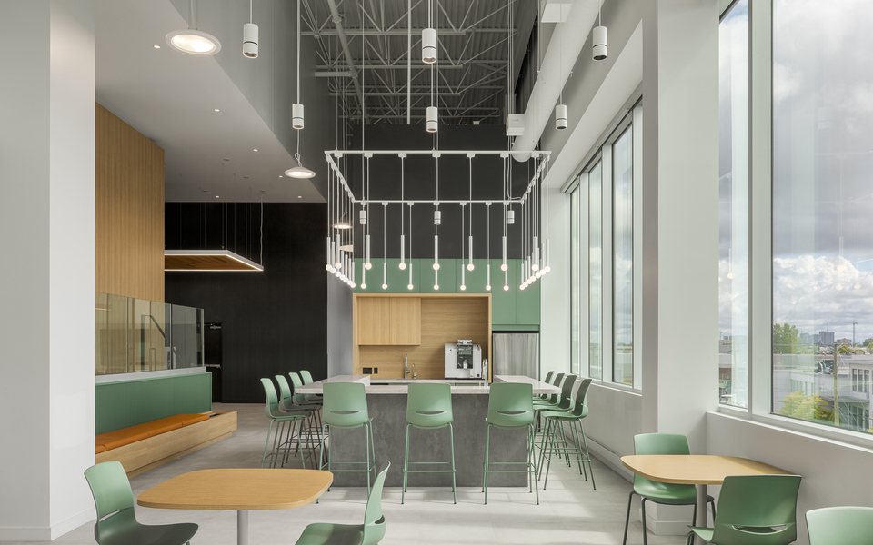 Developed in Laval by Cosoltec, the mixed-use Code440 project combines office and industrial spaces while also serving as the company’s headquarters. The 57,500 sq. ft. building stands out with its contemporary architecture and exposed timber structure.