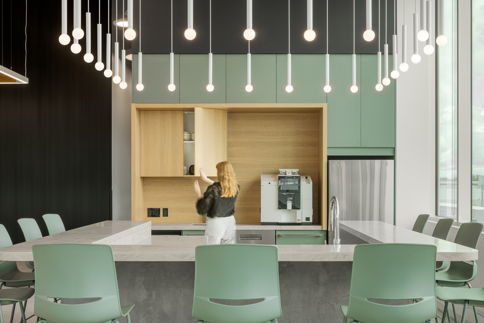 In addition to workstations, offices and meeting rooms, GKC designed various spaces conducive to relaxation and collaboration, including a laboratory, cafeterias, a lounge and a large terrace where employees can take a break and enjoy a meal outdoors on sunny days.