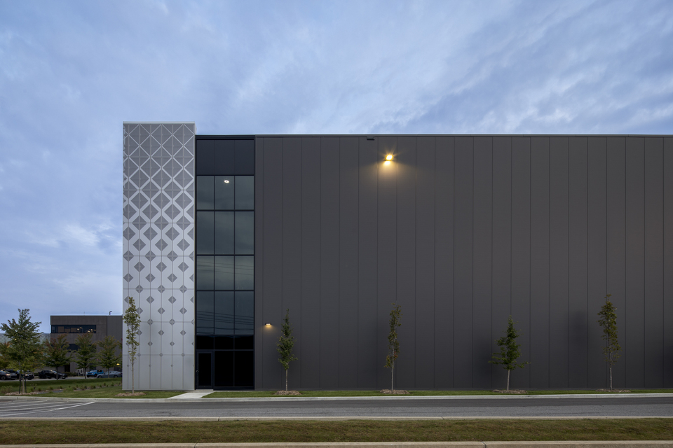 The customized graphic treatment of the panels used on the extension’s main façade significantly enhances the quality of the surrounding industrial environment and provide a positive interface with Cohen Street. They also create visual continuity with the neighbouring headquarters’ glass exterior through a gradient of diamond patterns, while anthracite grey metal panels complete the design on the other sides of the building.