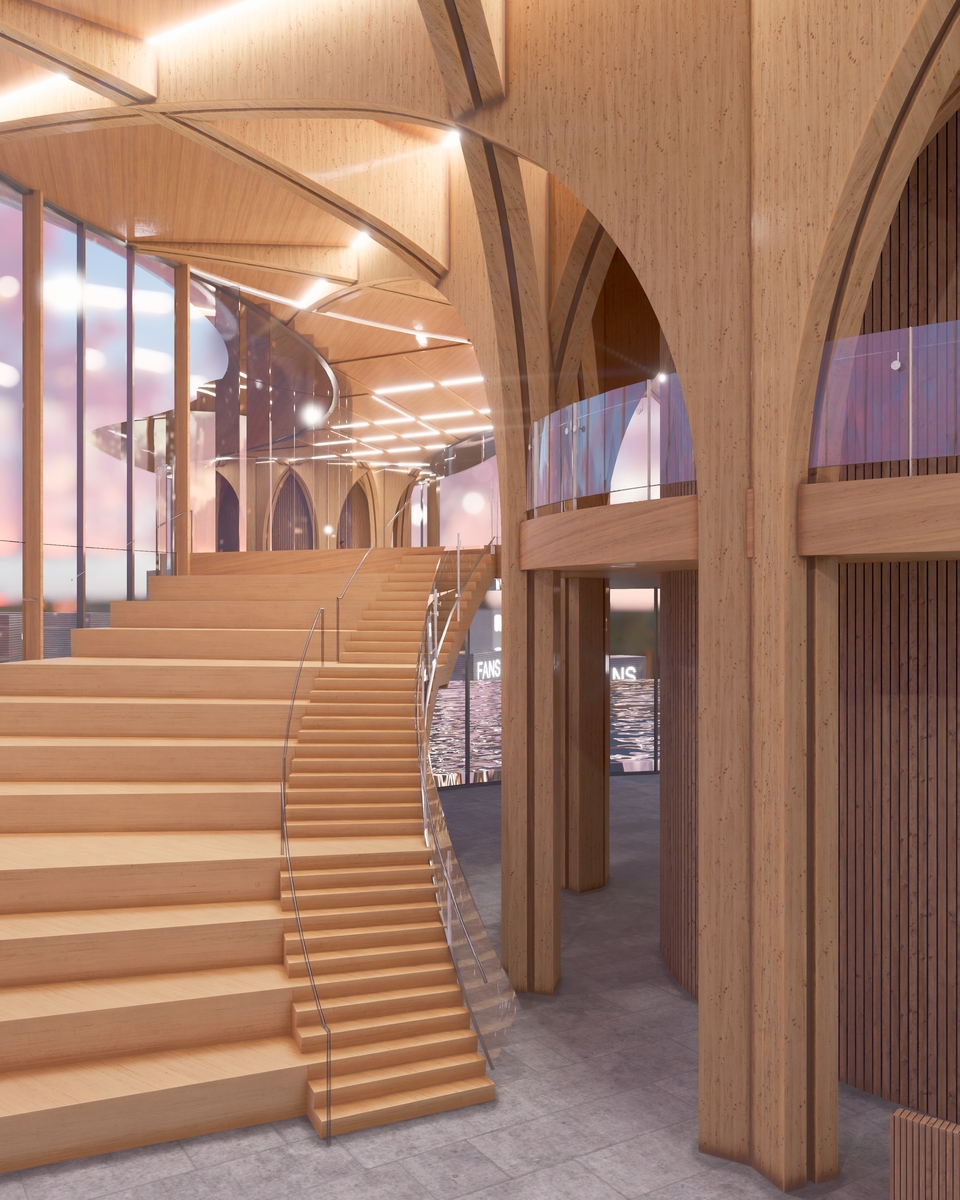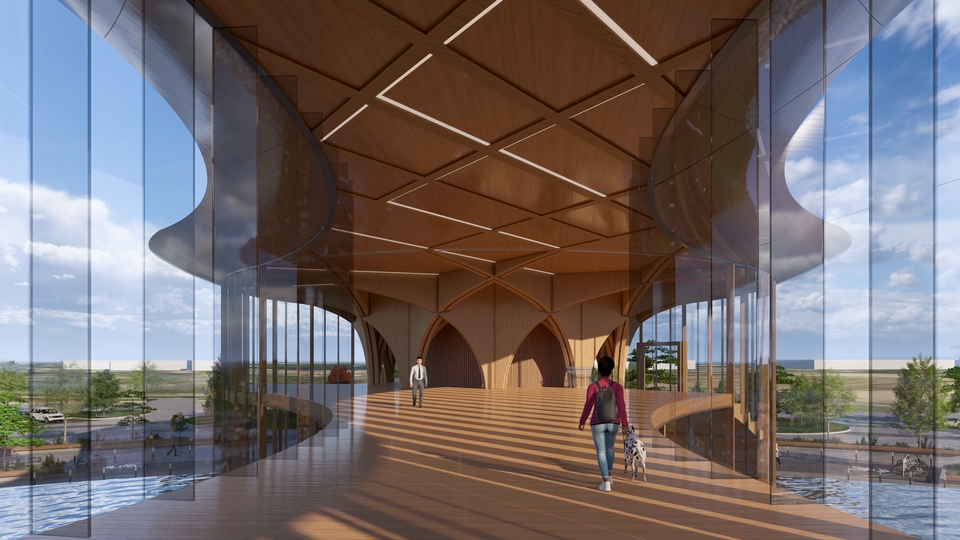 Le projet privilégie une structure en bois, ce qui réduit considérablement le recours au béton et à l’asphalte. Il intègre des stratégies environnementales éprouvées, dont l’utilisation d’énergies renouvelables, la gestion des eaux pluviales et des toitures végétalisées, qui contribuent à la réduction des îlots de chaleur et à la résilience du site.