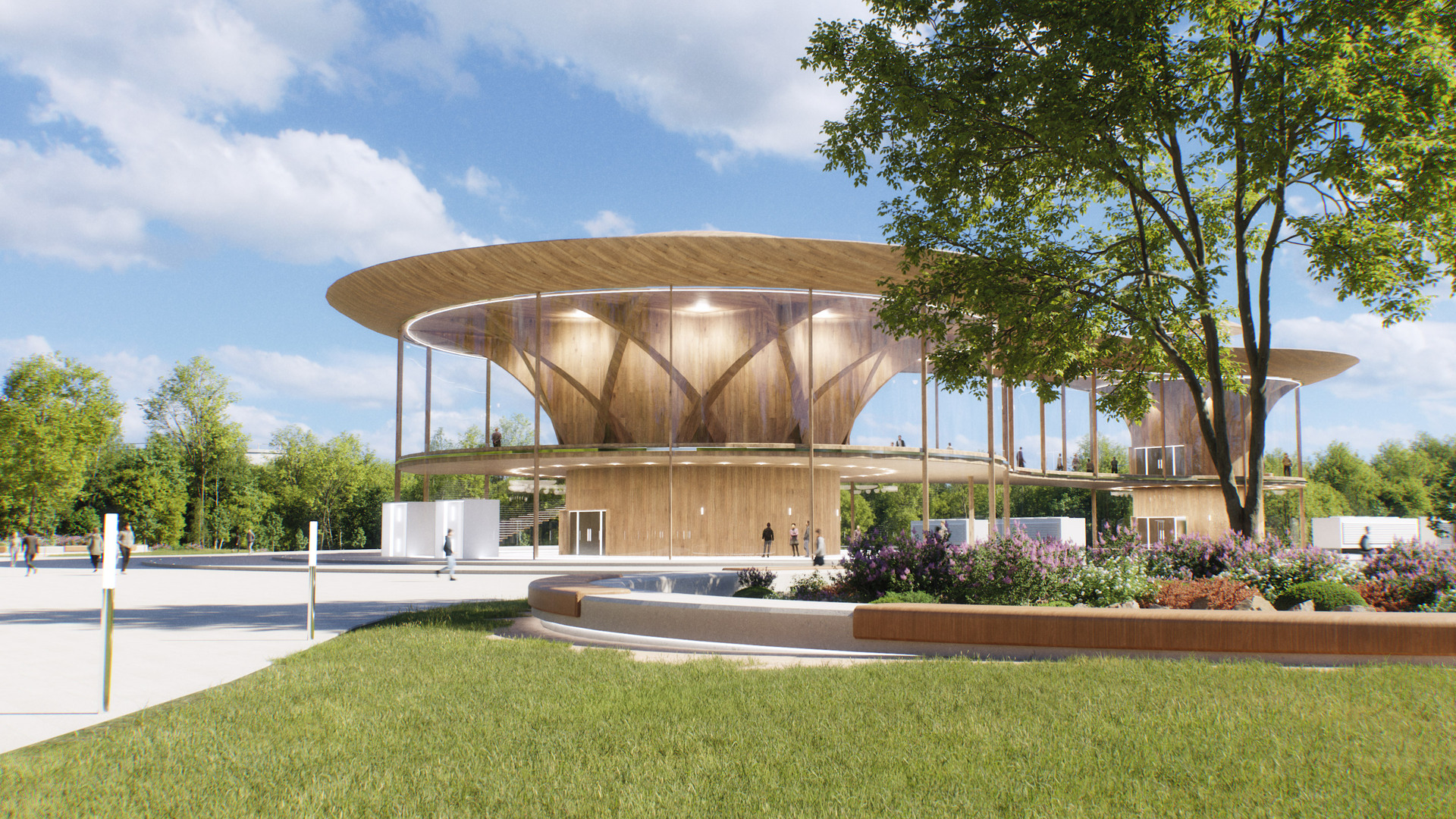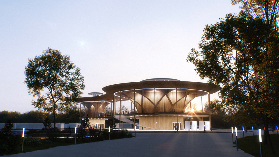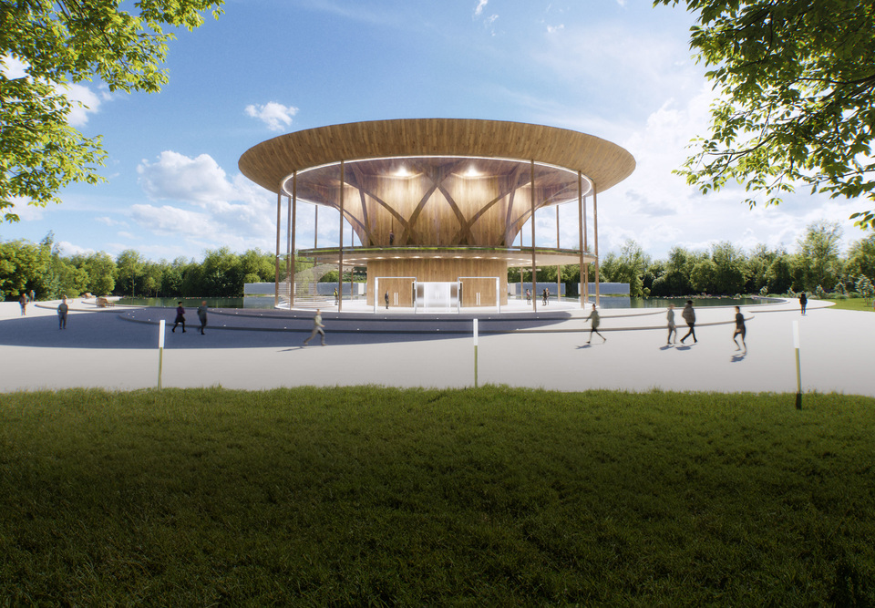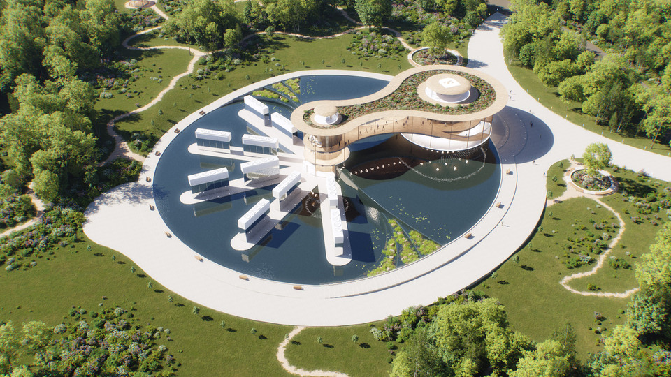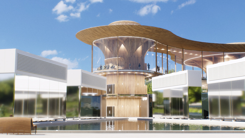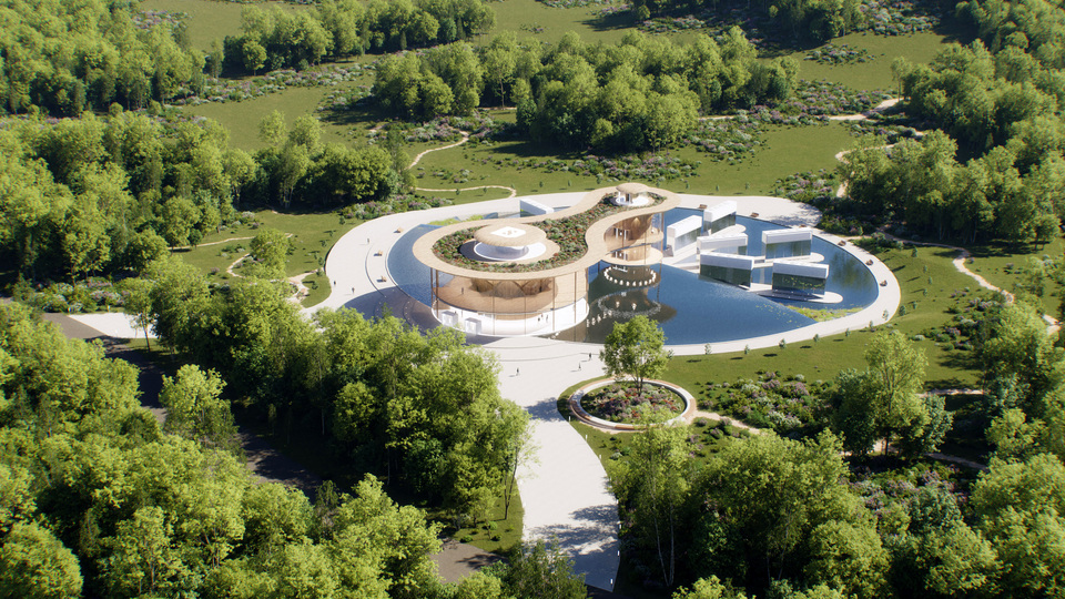 Le complexe s’organise autour de deux volumes circulaires reliés par une passerelle centrale, créant un parcours clair, fluide et intuitif pour les visiteurs. Un bassin d’eau et un chemin pavé bordé de végétation accompagnent les déplacements, tandis que les formes organiques, inspirées des dynamiques naturelles, génèrent des entrées en boucle qui facilitent l’orientation et la circulation sur le site.