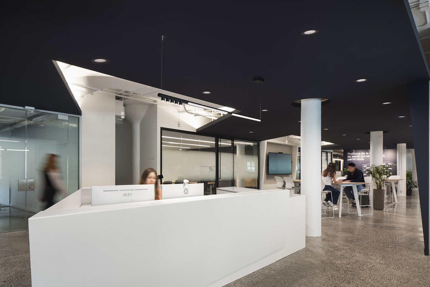 Afin d'exprimer le dynamisme et l’énergie de la marque, l’équipe a misé sur des formes anguleuses et des lignes nettement définies, ainsi que sur les nouvelles couleurs emblématiques de l’entreprise, le bleu foncé et le gris clair. Ces choix esthétiques s’expriment un peu partout dans les bureaux, du comptoir de réception à l’imposante retombée qui surplombe l'aire ouverte centrale, en passant par les appliques en trompe-l’œil sur les murs de la cafétéria, le mobilier ou encore les encadrements en projection qui surmontent les portes vitrées des salles de réunion. Cette scénographie vient soutenir et renforcer l’impression de mouvement recherchée par l’équipe afin de créer un milieu de travail à la fois stimulant et inspirant.