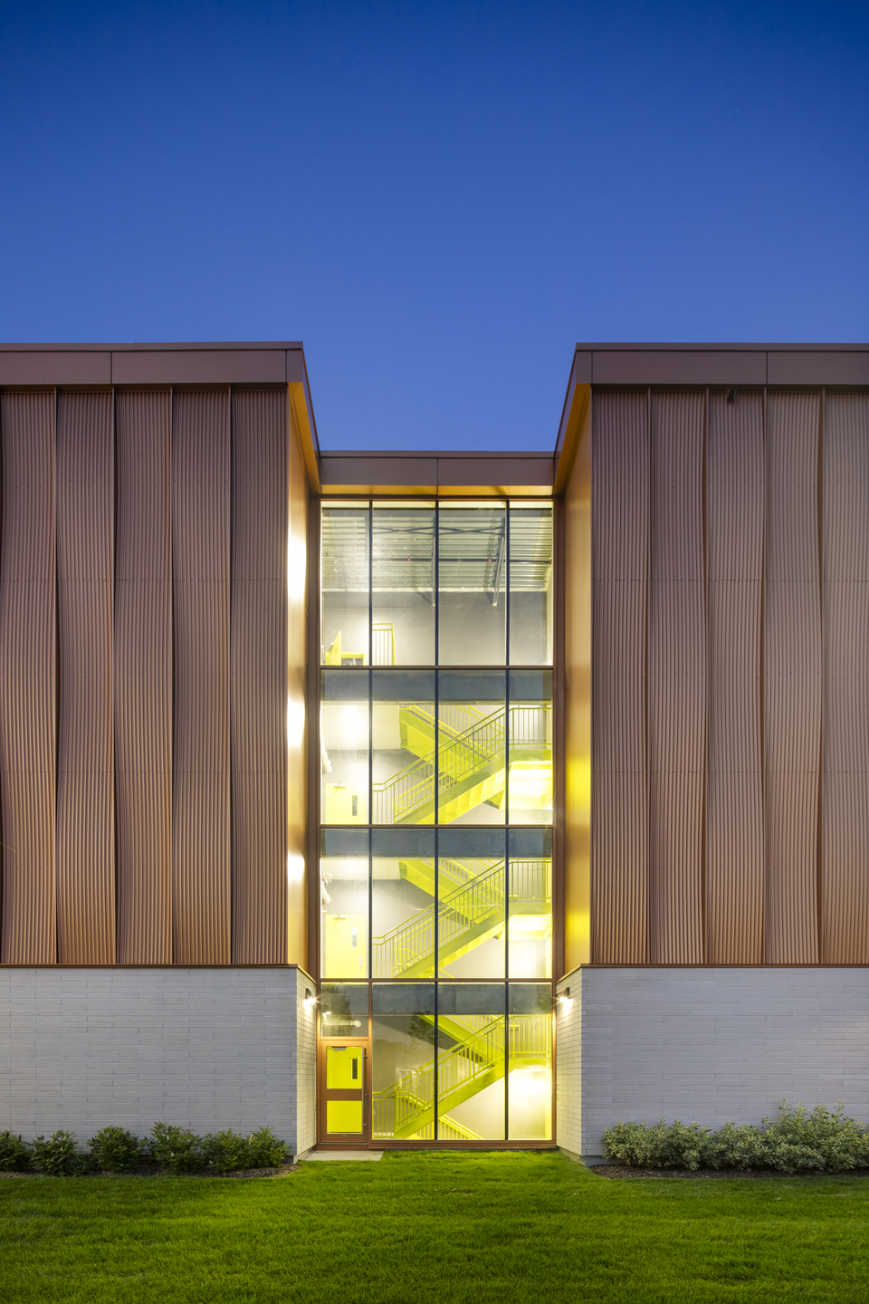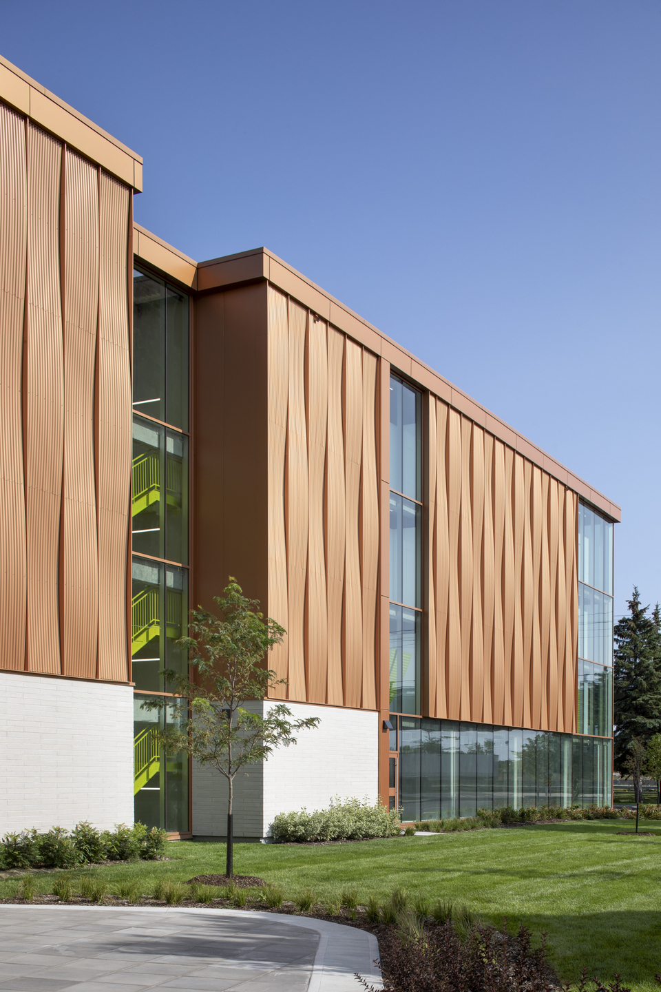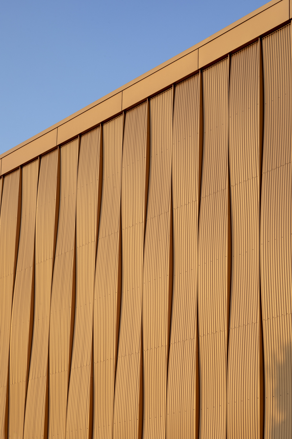 Au final, la municipalité a accepté le concept proposé par GKC, comprenant un habillage de panneaux de métal ondulé couleur cuivre (Copper Penny). Par leur forme, leur teinte et leur relief alterné, ces panneaux confèrent au bâtiment une identité visuelle distinctive et attrayante, à l’opposé du style « boîte à chaussures » souvent associé à ce type d’installations.