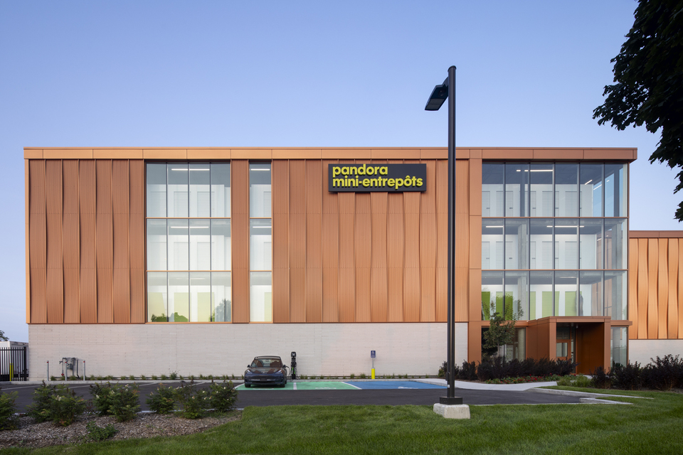 Pandora souhaitait développer le marché de l’entreposage en libre-service dans l’ouest de l’Île de Montréal, un secteur encore peu desservi dans ce domaine. Le projet était donc de construire un bâtiment abritant des mini-entrepôts de tailles variées répondant à une grande variété de besoins domestiques et commerciaux, ainsi que des espaces de travail locatifs. Stratégiquement situé entre l’autoroute 40 Ouest et le boulevard Brunswick, à Kirkland, le site retenu dispose d’une visibilité élevée dont le client voulait tirer parti avec une construction au design résolument original.