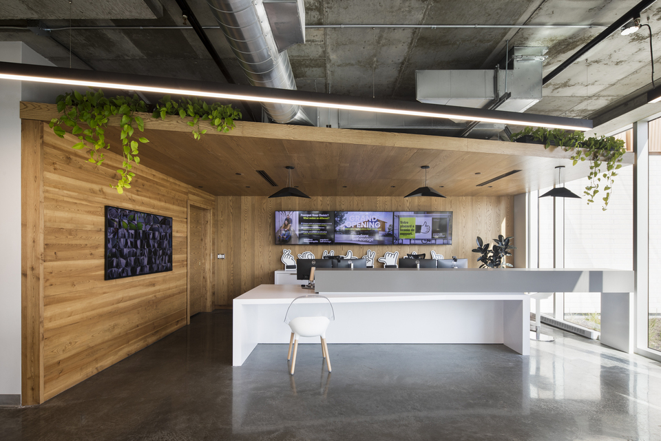 L’intérieur, et plus particulièrement l’espace de réception, poursuit ce dialogue avec une composition architecturale invitante où les angles du mobilier, la combinaison du bois et du béton brut, les conduits de ventilation apparents et l’éclairage se marient pour créer une atmosphère accueillante pour les clients et les employés. Aucun détail n’a été négligé pour conférer un caractère organique à l’environnement, jusqu’aux marques de veinage laissées par les coffrages en bois sur le plafond en béton, qui apportent une patine inédite à ce matériau industriel.